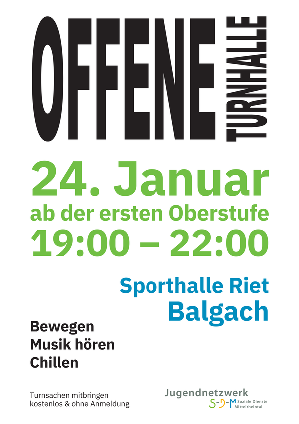 Am Samstagabend, den 24. Januar öffnet die Sporthalle Riet in Balgach von 19:00 Uhr bis 22:00 Uhr für Jugendliche ab der Oberstufe. Sie haben die Möglichkeit, sich ohne Anmeldung und kostenlos sportlich zu betätigen und sich mit Gleichaltrigen zu treffen. Begleitet wird die Offene Turnhalle vom Jugendnetzwerk der Sozialen Dienste Mittelrheintal (SDM).